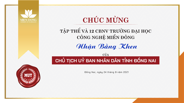 Ngày 24.09.2021, Chủ tịch Ủy ban nhân dân tỉnh Đồng Nai đã có quyết định khen thưởng cho 02 tập thể và 12 cá nhân là cán bộ, nhân viên trường Đại học Công nghệ Miền Đông...