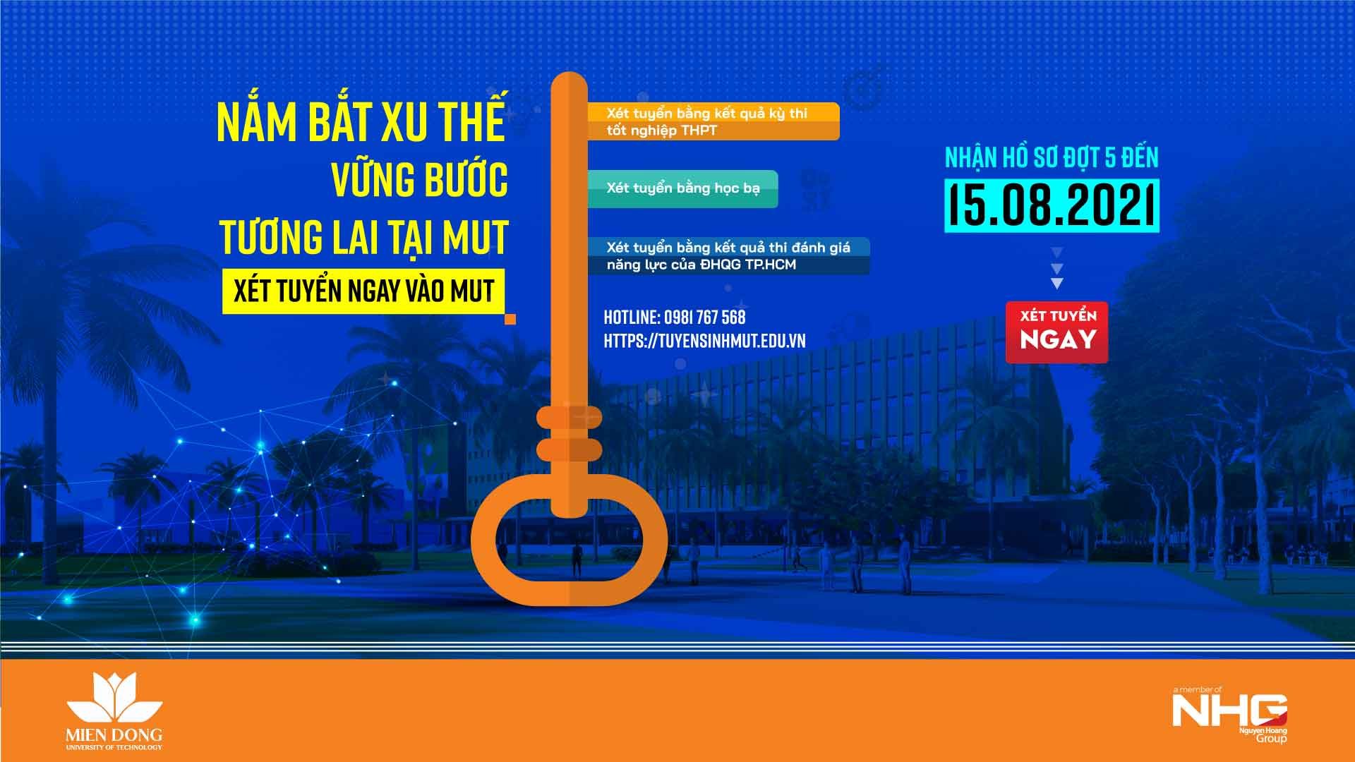 Hội đồng tuyển sinh MUT thông báo tiếp tục nhận hồ sơ xét tuyển học bạ đợt 5 theo cả 02 phương thức (xét tuyển học bạ lớp 12 theo tổ hợp 03 môn và điểm trung bình cả năm lớp 12) đến ngày 15/8 cho tất cả các ngành đào tạo tại trường.