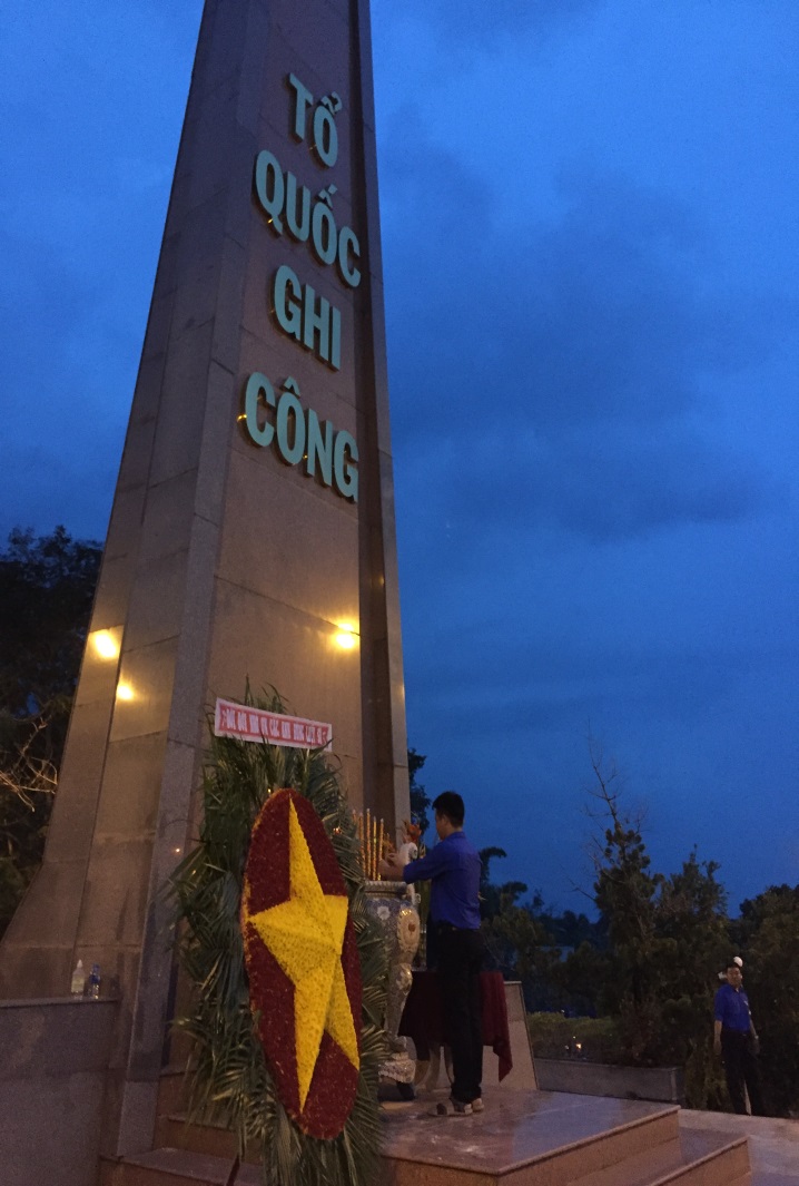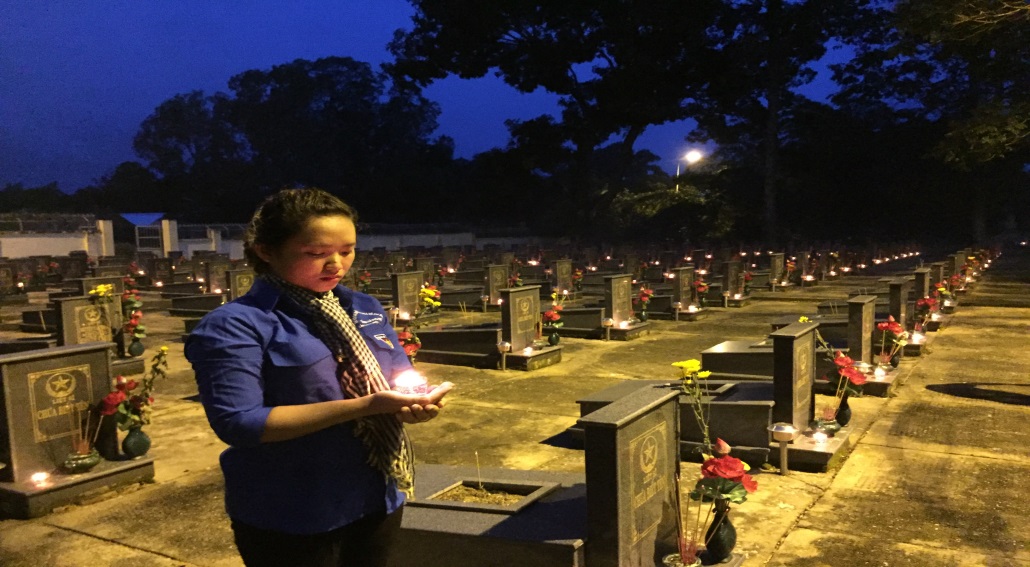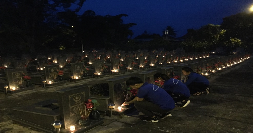 (Các chiến sĩ tình nguyện thắp nến tri ân tại nghĩa trang huyện Định Quán)