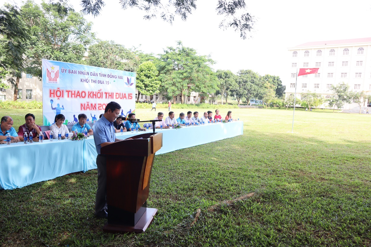 Hiệu trưởng Trường Cao đẳng Công nghệ Cao Đồng Nai Lê Anh Đức, Khối trưởng Khối thi đua 15 phát biểu khai mạc hội thao.