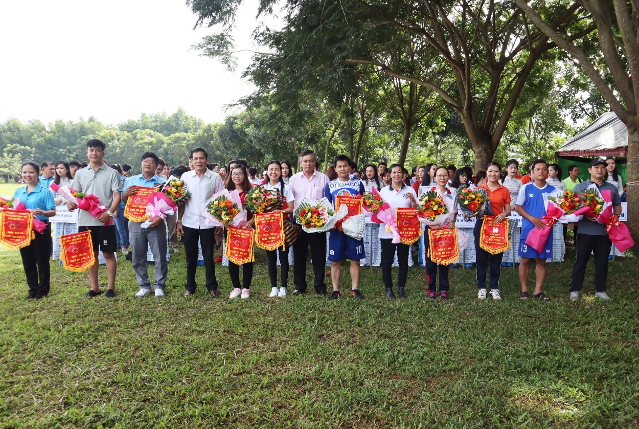 Đồng chí Nguyễn Tiến Dũng, Phó trưởng ban Thi đua khen thưởng tỉnh và ban tổ chức trao cờ lưu niệm cho các đội tham dự hội thao.