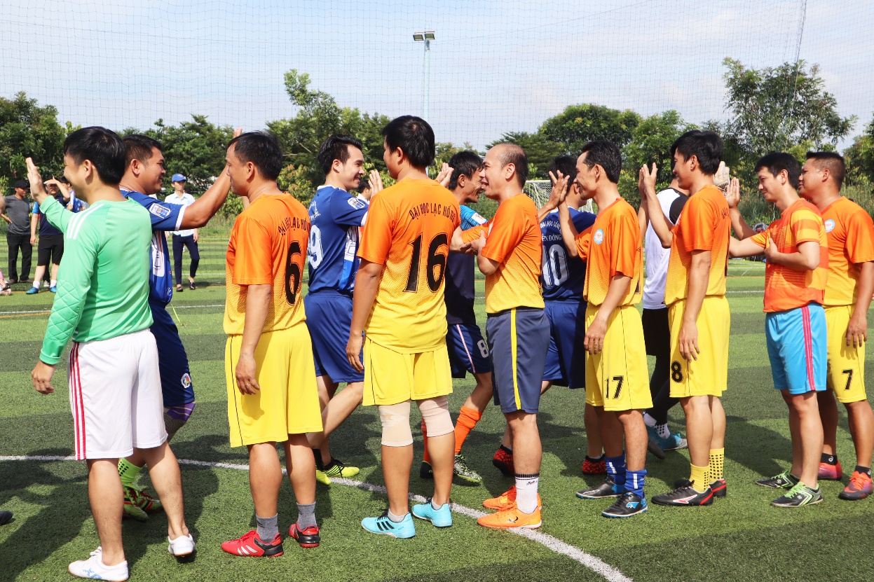 Hai đội bóng ĐH Công nghệ Miền Đông (áo xanh) và ĐH Lạc Hồng (áo cam) chào thủ tục trước trận chung kết.