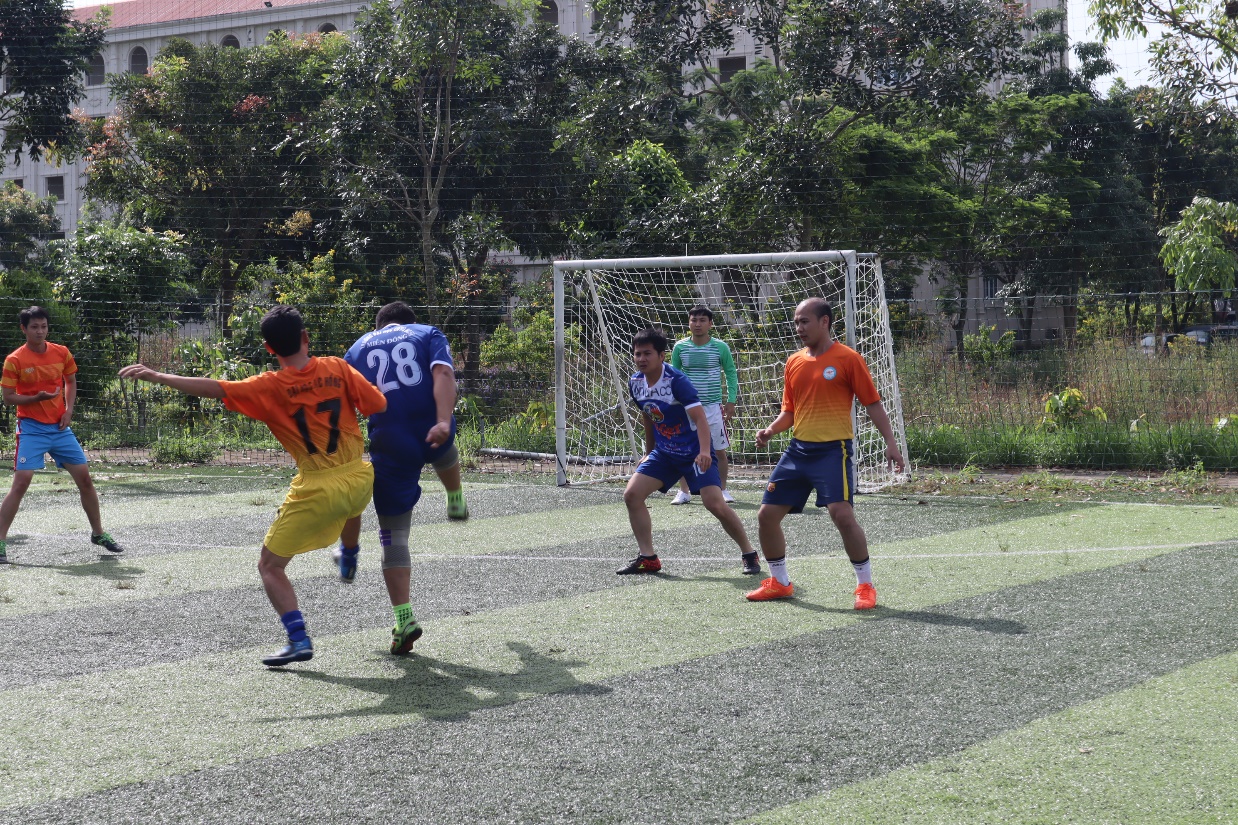 Đội bóng Trường ĐH Công nghệ Miền Đông trong một pha tấn công cầu môn Đội bóng Trường ĐH Lạc Hồng.