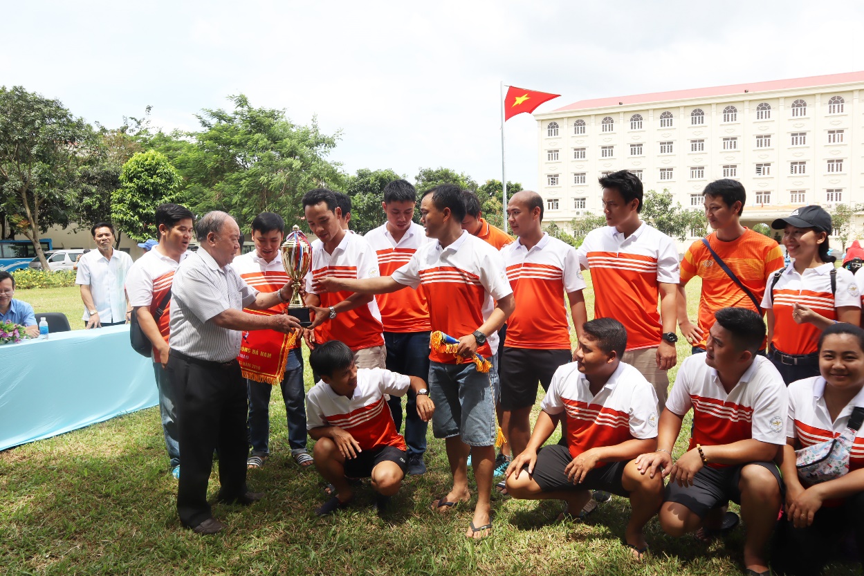 PGS.TS. NGND Huỳnh Văn Hoàng, Hiệu trưởng Trường ĐH Công nghệ Miền Đông trao cúp vô địch cho đội bóng đá Trường ĐH Lạc Hồng.