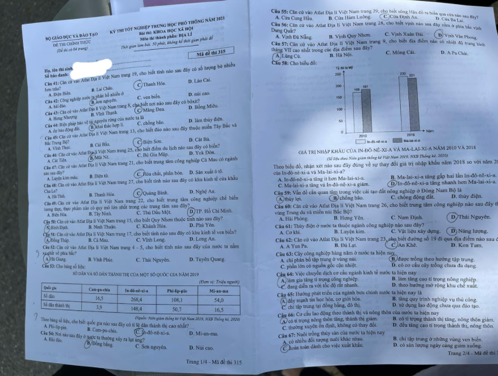 Mời các bạn thí sinh tham khảo đề thi môn Địa lý 2021 - Mã đề thi 315