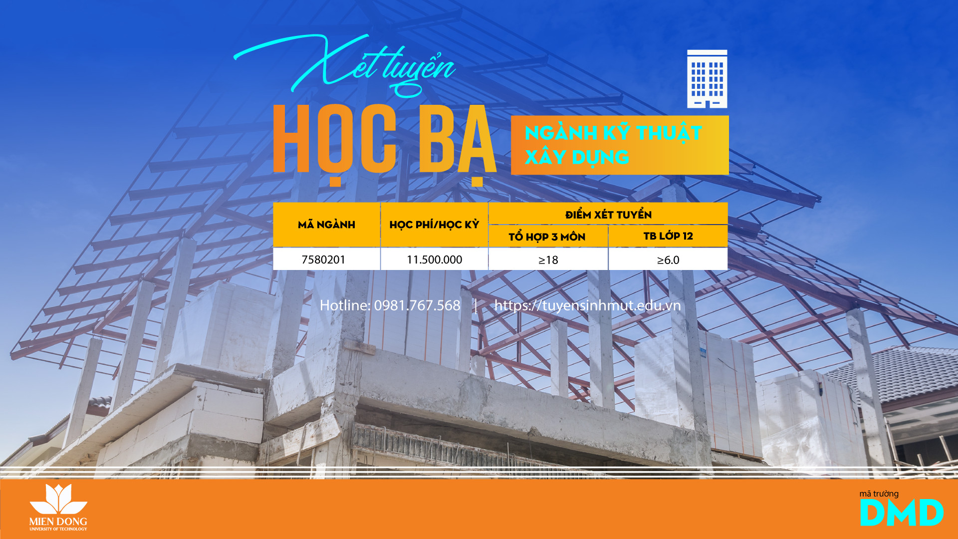 Năm 2021, trường Đại học Công nghệ Miền Đông xét tuyển học bạ ngành Ngành kỹ thuật xây dựng theo các tổ hợp môn