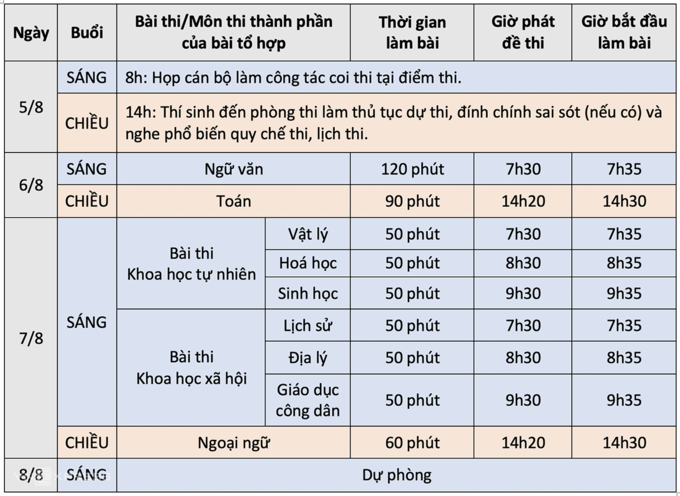 Tương tự các bạn thi đợt 1, thí sinh dự thi hôm nay sẽ làm bài môn Ngữ văn trong 120 phút vào buổi sáng và Toán trong 90 phút vào buổi chiều. Ngày 7/8, các em sẽ làm bài tổ hợp Khoa học tự nhiên (Toán, Vật lý, Hóa học) hoặc Khoa học xã hội (Lịch sử, Địa lý, Giáo dục công dân) vào buổi sáng với thời gian làm bài mỗi môn trong tổ hợp là 50 phút; và làm bài Ngoại ngữ trong 60 phút vào buổi chiều. Lịch thi cụ thể như sau: