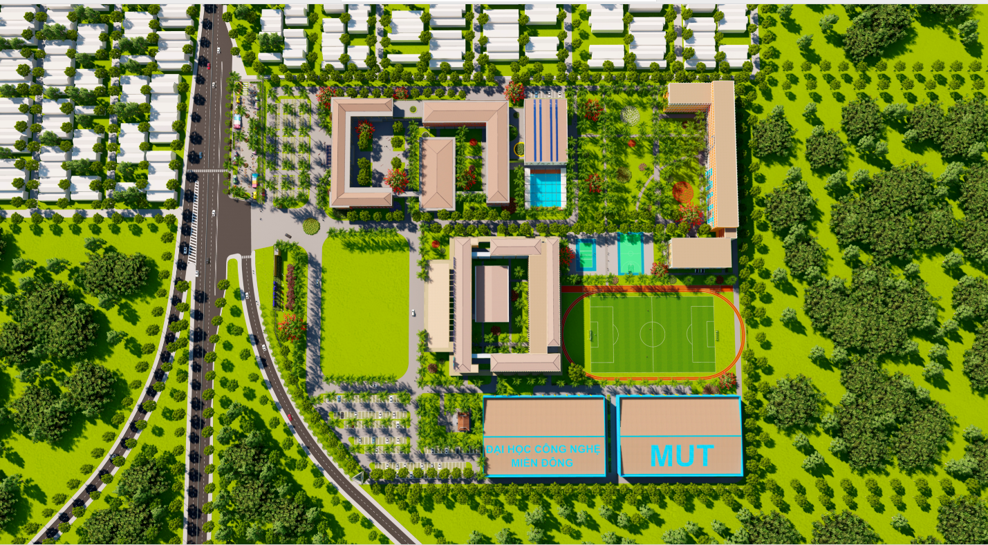 Phối cảnh mới của Trường Đại học Công nghệ Miền Đông với vườn dược liệu lớn, khu thí nghiệm – thực hành tiêu chuẩn, hồ bơi, sân bóng,…