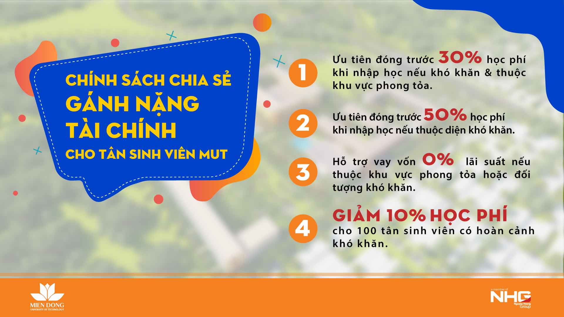Với mục tiêu chia sẻ gánh nặng học phí - nhân lên cơ hội học tập, trường Đại học Công nghệ Miền Đông tiếp tục dành 04 chính sách chia sẻ gánh nặng tài chính cho Tân sinh viên chịu ảnh hưởng của dịch Covid-19, cụ thể như sau:
