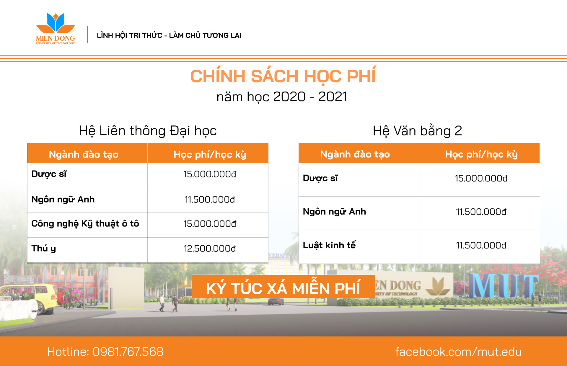 Ngoài ra, năm học 2021 - 2022 Trường đại học Công nghệ Miền Đông tuyển sinh hệ Liên thông Đại học Chính quy và Đại học chính quy Văn bằng 2 các ngành với mức học phí: