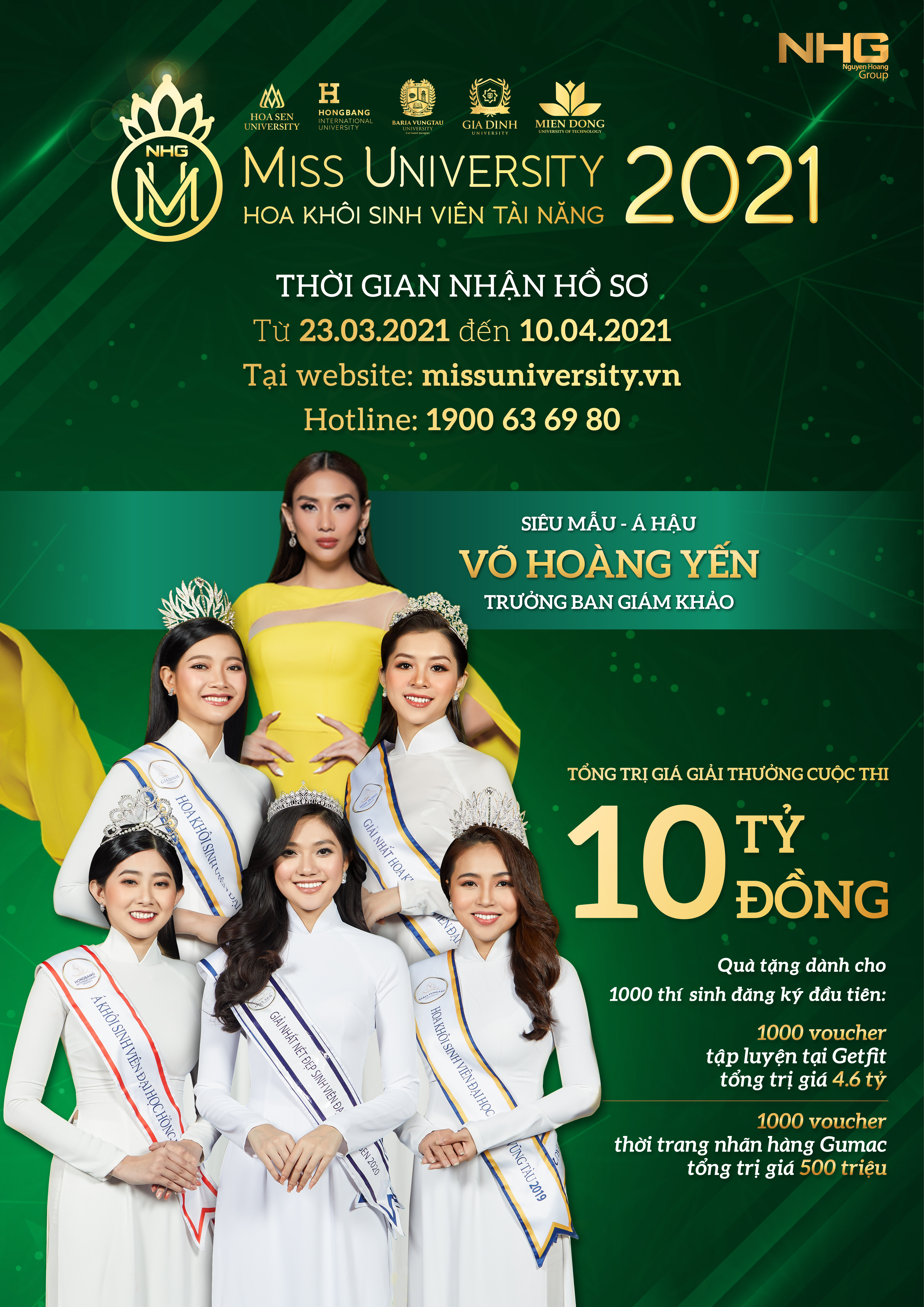 Miss University NHG 2021 sẽ chọn ra những gương mặt nữ sinh viên tài năng tiêu biểu trong hệ thống của Tập đoàn giáo dục Nguyễn Hoàng (NHG) để truyền cảm hứng cho các bạn sinh viên.