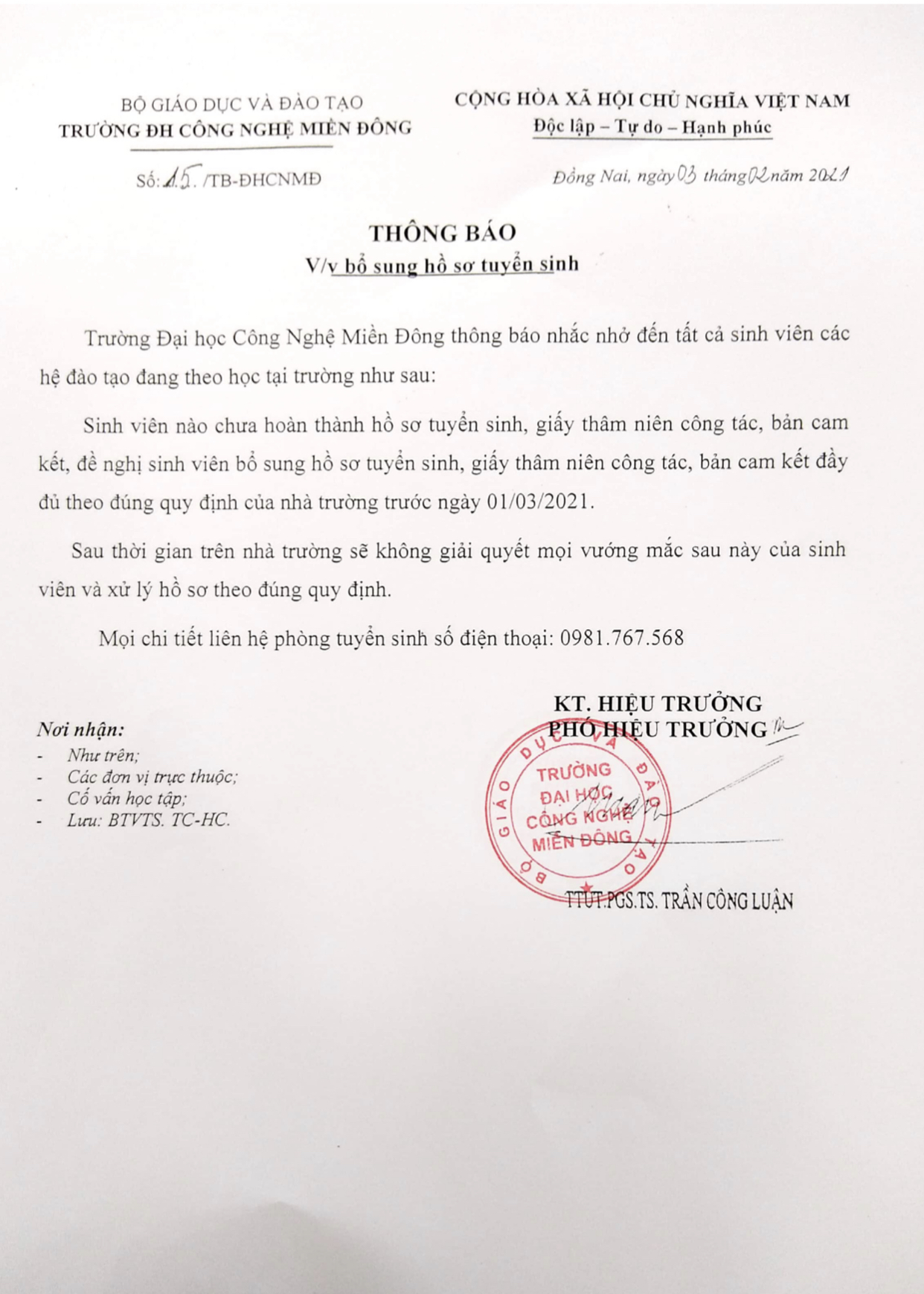 Thông báo về việc bổ sung hồ sơ tuyển sinh