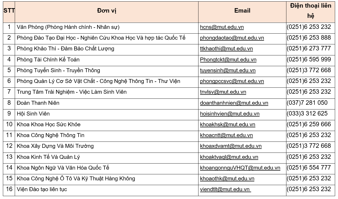 Các thông tin liên hệ phòng ban, khoa, viện, trung tâm sinh viên MUT cần biết