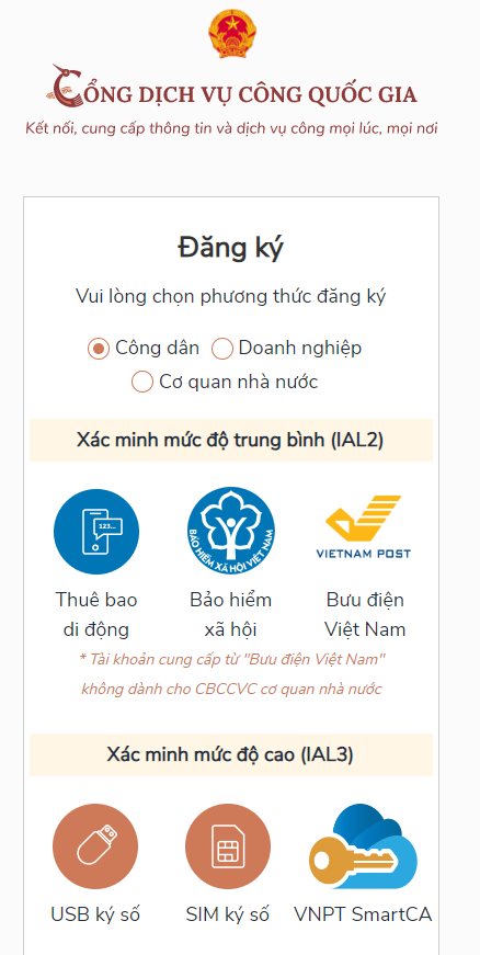 Bước 2: Nếu đã có tài khoản dịch vụ công quốc gia thì thực hiện đăng nhập, nếu chưa có thì nhấn vào Đăng ký