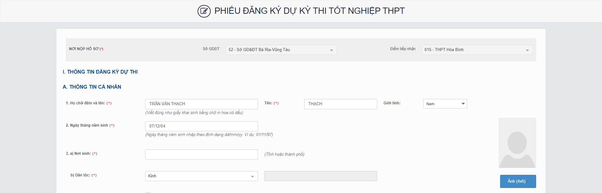 Giao diện nhập phiếu đăng ký trực tuyến