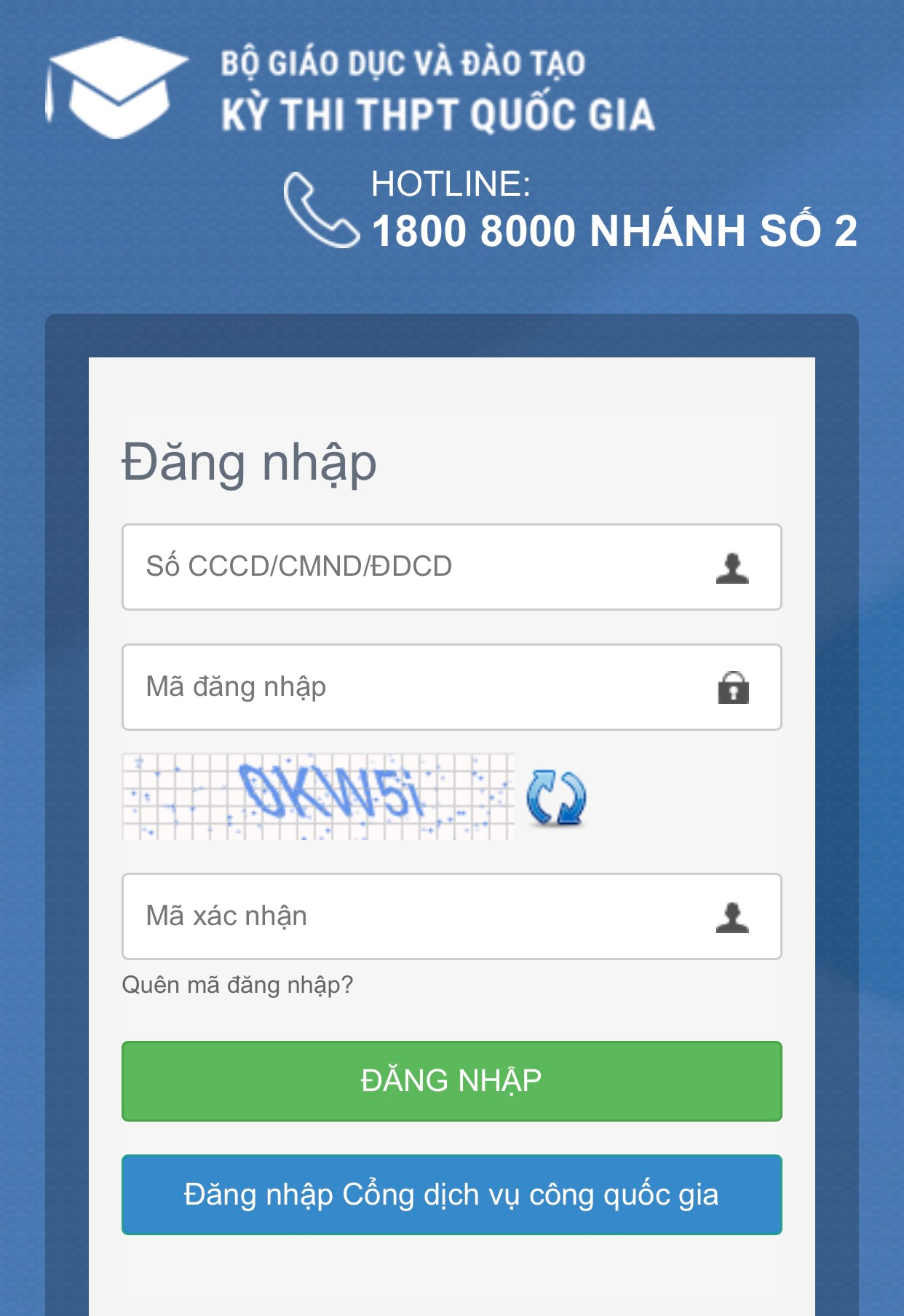 Bước 1: Thí sinh đăng nhập bằng chứng minh thư và mã đăng nhập (mật khẩu) mà điểm tiếp nhận hồ sơ cung cấp hoặc trong mail đã nhận. Sau khi đăng nhập, màn hình Đổi mã đăng nhập sẽ được hiển thị. Thí sinh thực hiện đổi mã đăng nhập (đổi mật khẩu).