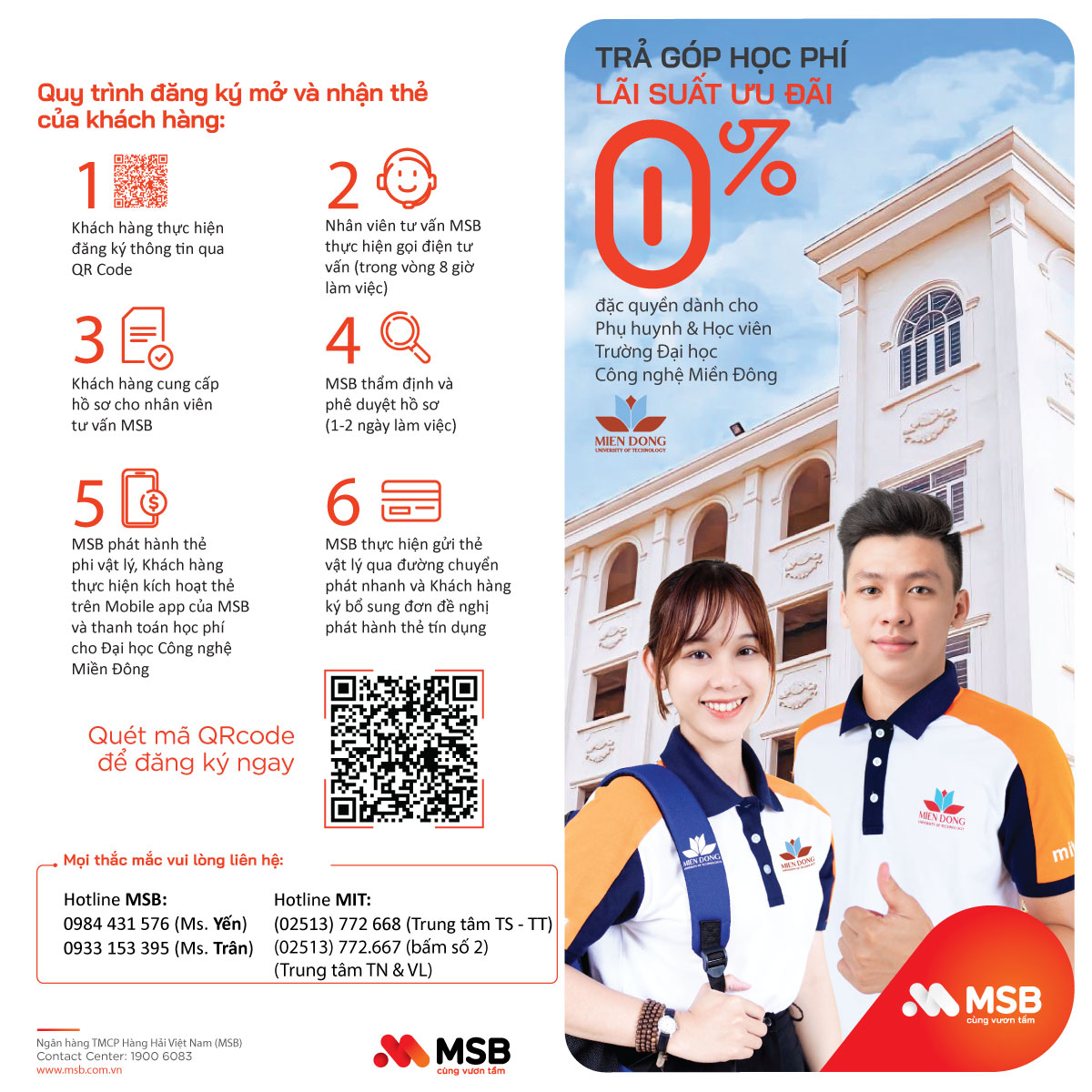 1. Từ tháng 05/2022 đến 31/03/2023, trường Đại học Công nghệ Miền Đông - MIT University kết hợp cùng Ngân hàng Thương mại Cổ phần Hàng Hải Việt Nam - MSB hỗ trợ cấp thẻ tín dụng chuyển đổi trả góp lãi suất 0% cho mọi sinh viên MIT University.