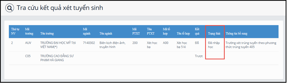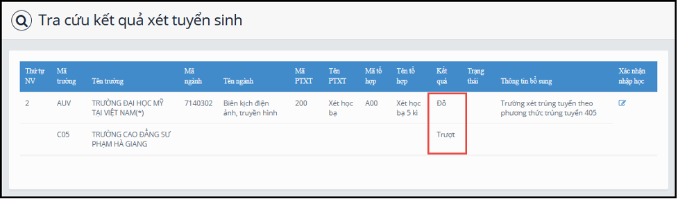 Nếu kết quả là Trượt có nghĩa là thí sinh trượt tất cả các nguyện vọng đã đăng ký vào trường.