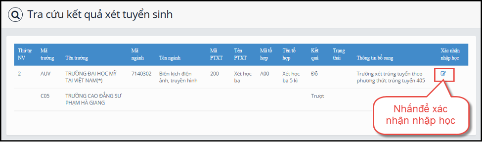 Đối với nguyện vọng đỗ thí sinh có quyền xác nhận nhập học. Để xác nhận nhập học thí sinh nhấn nút Xác nhận nhập học như hình dưới.