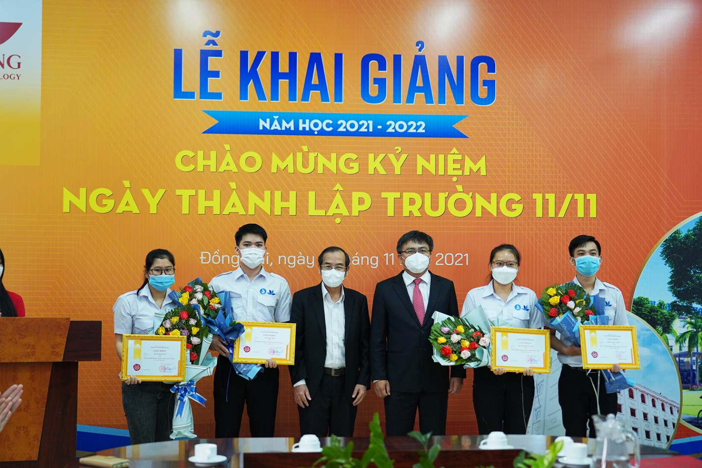 Lâm Thiên Phúc (thứ 2 từ bên trái qua) trong buổi lễ tuyên dương sinh viên đạt thành tích xuất sắc năm học 2020 – 2021.