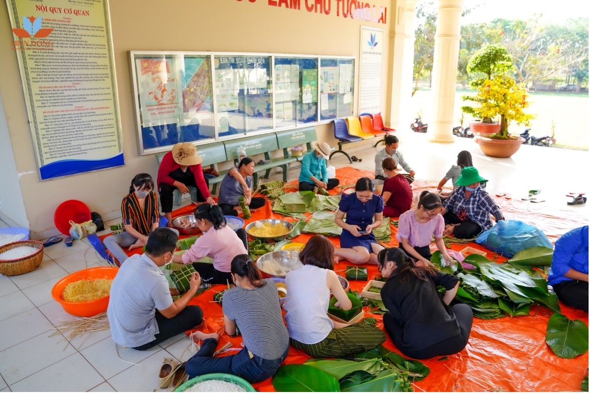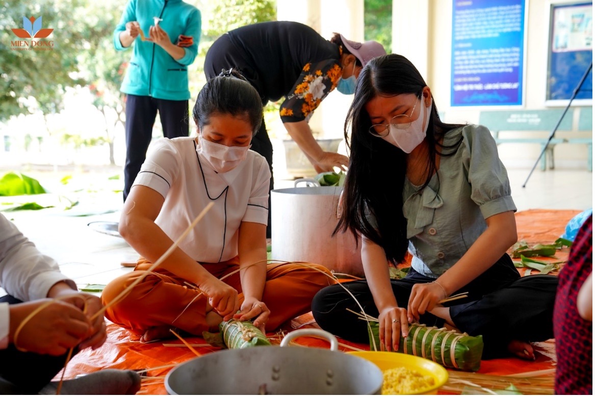 Tập thể cán viên, cán bộ, nhân viên trường Đại học Công nghệ Miền Đông tham gia gói bánh chưng, bánh tét để trao tặng “vị Tết” cho các hoàn cảnh khó khăn.