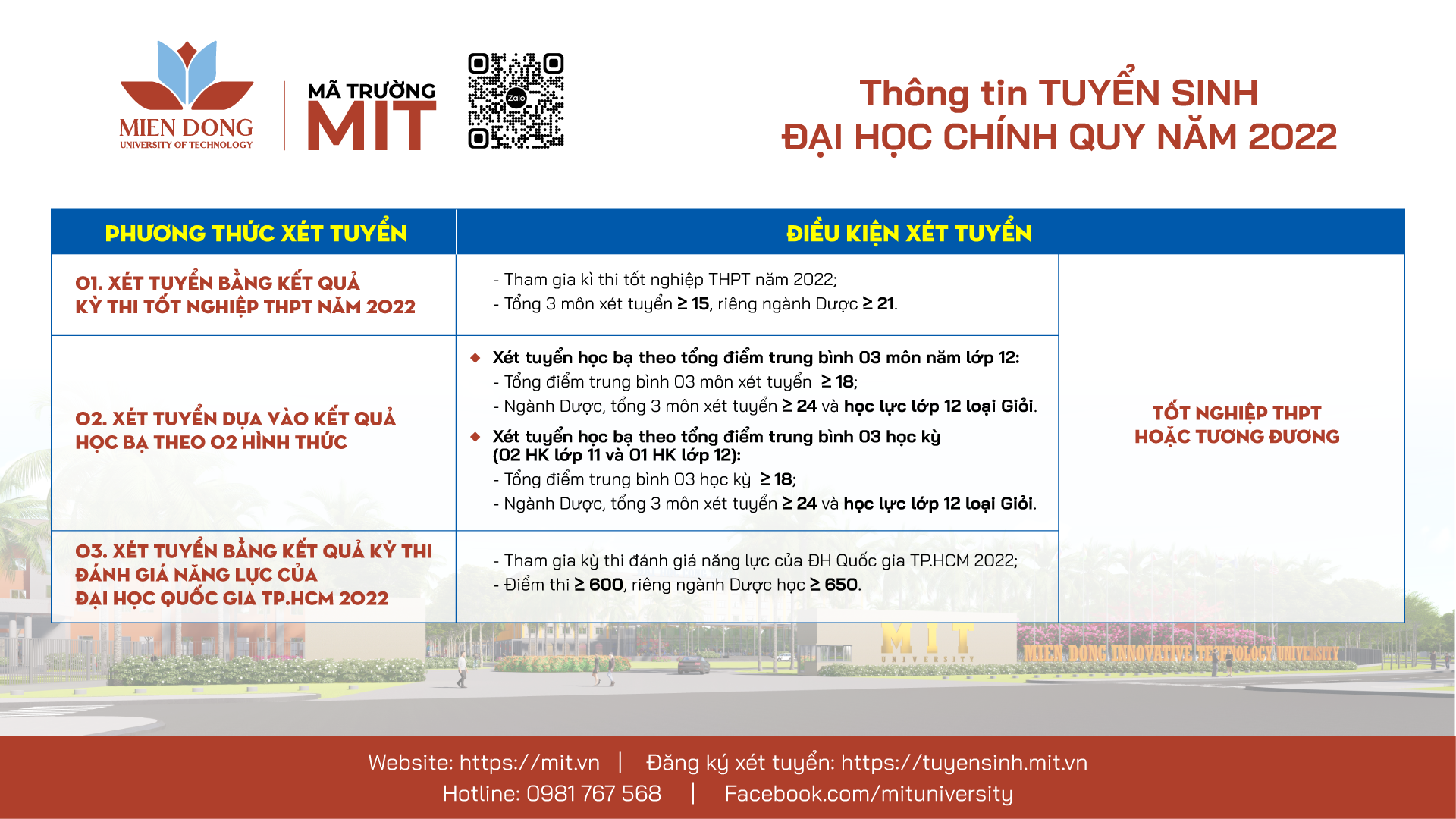Năm học 2022 – 2023, trường Đại học Công nghệ Miền Đông – MIT University tuyển sinh với 16 ngành và 32 chuyên ngành đào tạo bằng 04 phương thức xét tuyển.