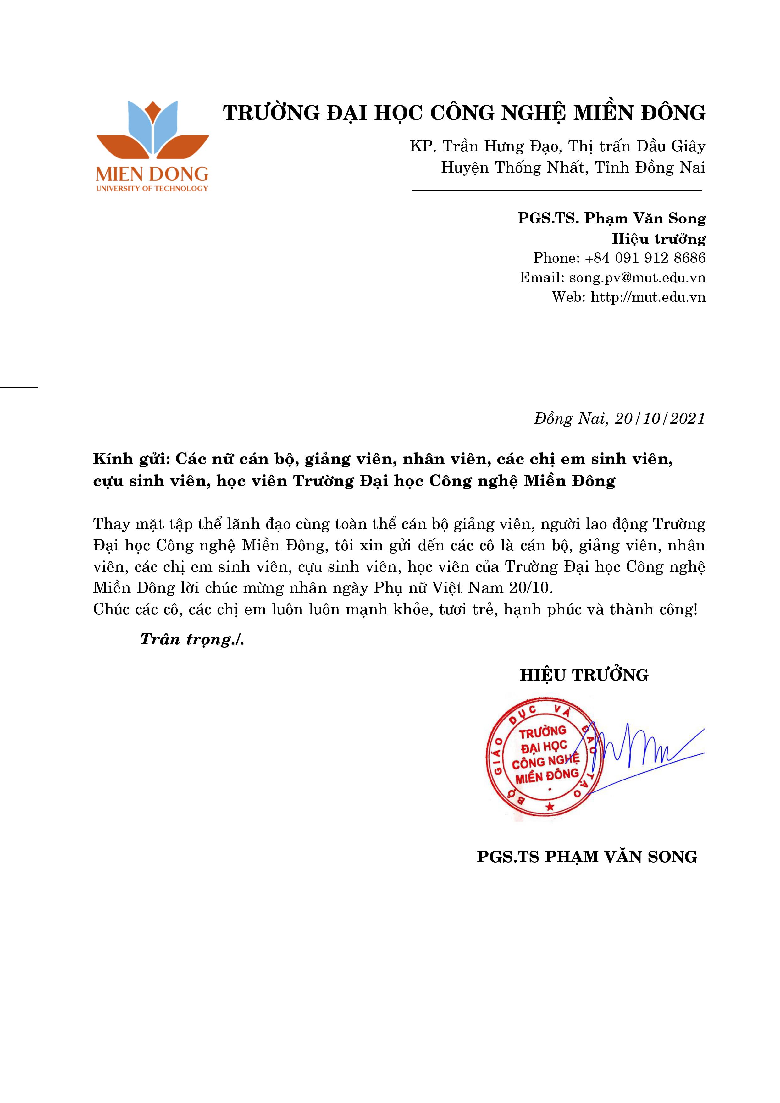 Thư chúc mừng ngày Phụ nữ Việt Nam 20.10 của Hiệu trưởng Trường Đại học Công nghệ Miền Đông