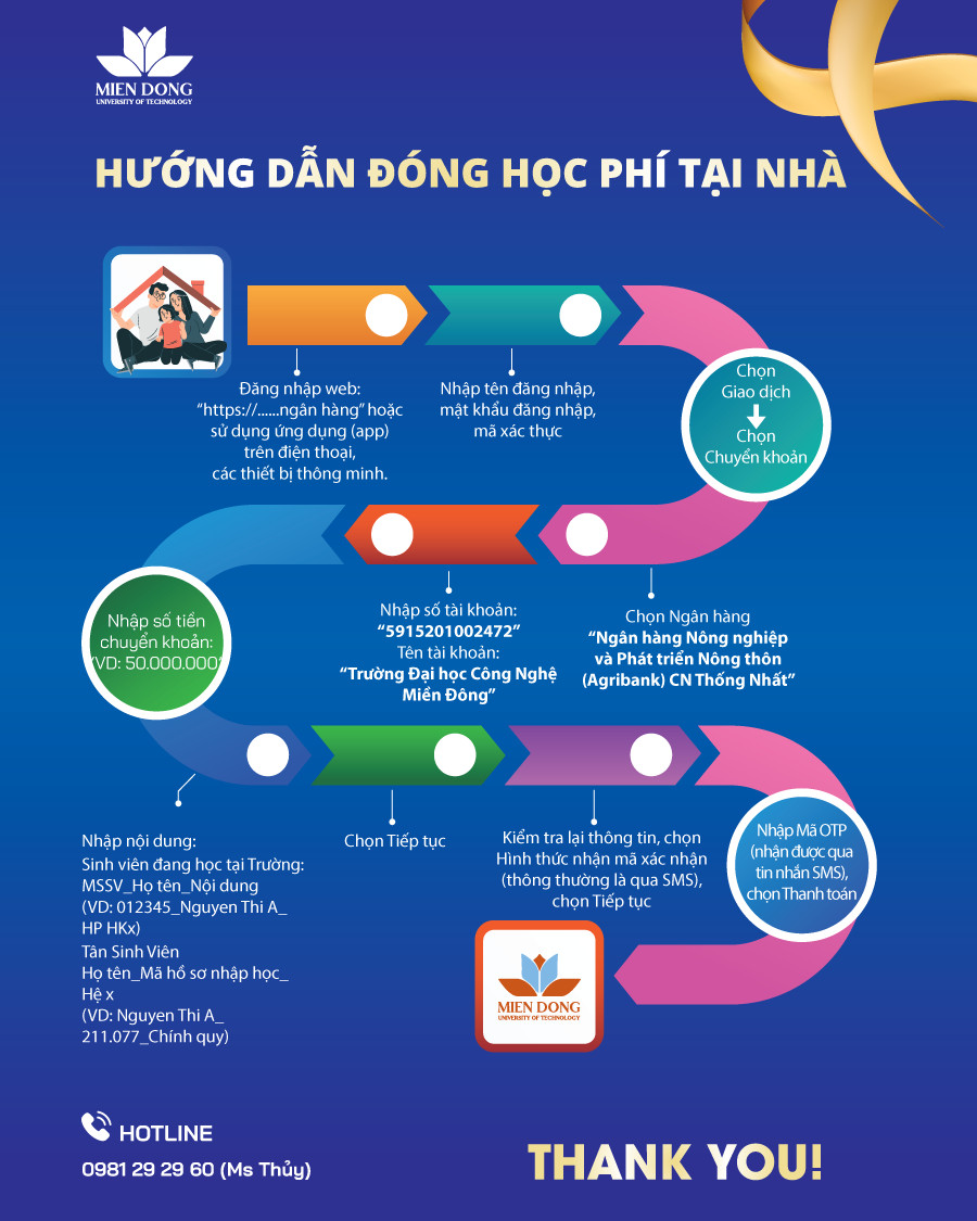 Hiện nay, tình hình dịch bệnh Covid-19 diễn biến phức tạp, để đảm bảo quá trình học tập xuyên suốt của các bạn sinh viên, đồng thời bảo vệ sức khỏe cho các bạn. Trường đại học Công nghệ Miền Đông áp dụng hình thức đóng học phí trực tuyến dễ dàng và tiện lợi: