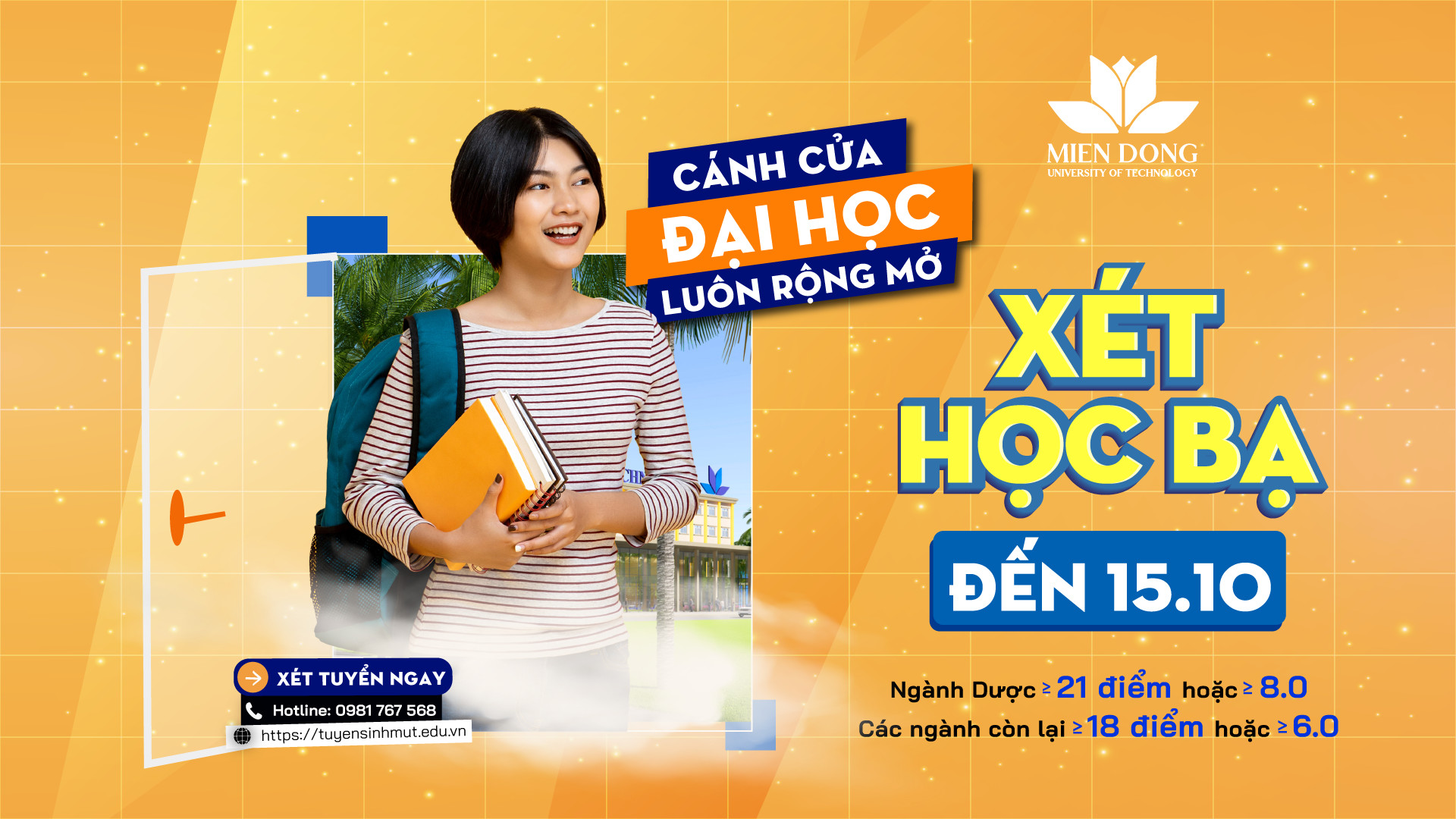 Hội đồng tuyển sinh MUT thông báo tiếp tục nhận hồ sơ xét tuyển học bạ đợt 9 theo cả 02 phương thức (xét tuyển học bạ lớp 12 theo tổ hợp 03 môn và điểm trung bình cả năm lớp 12) đến ngày 10/10 cho tất cả các ngành đào tạo tại trường; điểm nhận hồ sơ của từng ngành là từ mức điểm trúng tuyển đợt 8 của ngành đó trở lên. Riêng với ngành Dược học, thí sinh cần đảm bảo quy định của Bộ GD&ĐT về điều kiện xét tuyển khối ngành Khoa học sức khỏe (đạt Học lực Giỏi lớp 12 đối với ngành Dược học).