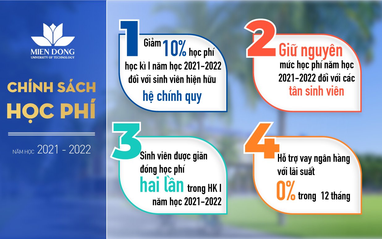 Ngoài ra, năm 2021 Trường đại học Công nghệ Miền Đông có chính sách học phí ưu đãi, các suất học bổng giá trị và các chính sách chia sẻ gánh nặng tài chính dành cho các bạn Tân sinh viên.